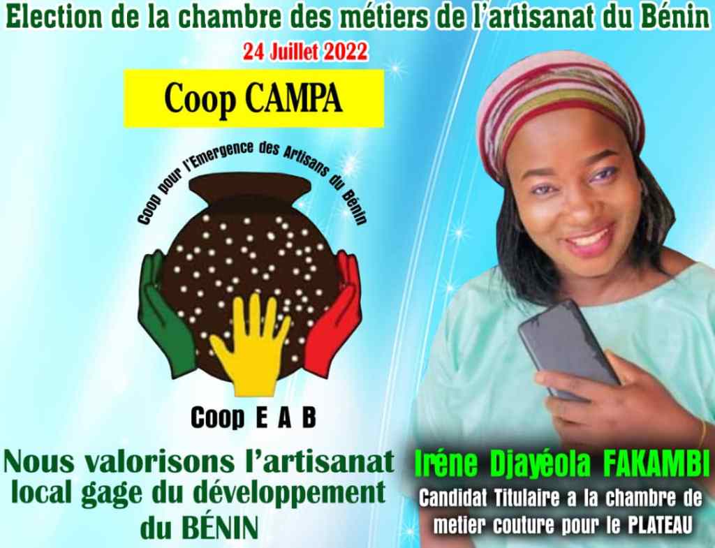Irène Djayéola Fakambi ratisse large pour Coop CAMPA dans la commune de pobè et environs. A quelques jours des élections consulaires à la chambre des métiers de l’artisanat Béninois, les différents états majors se font de jour en jour plus visible. Dans le Plateau, les pronostics vont à l’actif du regroupement Coop CAMPA avec la candidate titulaire Irène Djayéola Fakambi qui laisse nulle place où la main ne passe et repasse. De commune en commune, de quartier en quartier, de village en village, d’atelier en atelier, elle et son Staff vont au contact des artisans de leur expliquer la Vision de Coop CAMPA et son plan d’action au profit des artisans