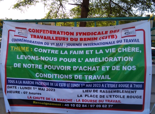 Toujours dans sa démarche d’attirer l’attention des gouvernants sur leurs rôles, la Confédération Syndicale des Travailleurs du Bénin (la CSTB) invite tous les béninois à la marche qu’elle organise le lundi 1er Mai prochain. Pour rappel, le regroupement est annoncé pour 07 heures 00 à la place de l’étoile rouge. Elle est rassure de la bonne organisation pour permettre à tous les marcheurs de mieux se sentir car les autorités en charge de la sécurité sont informées et la police ferait convenable son travail a déclaré le SG Kassa.