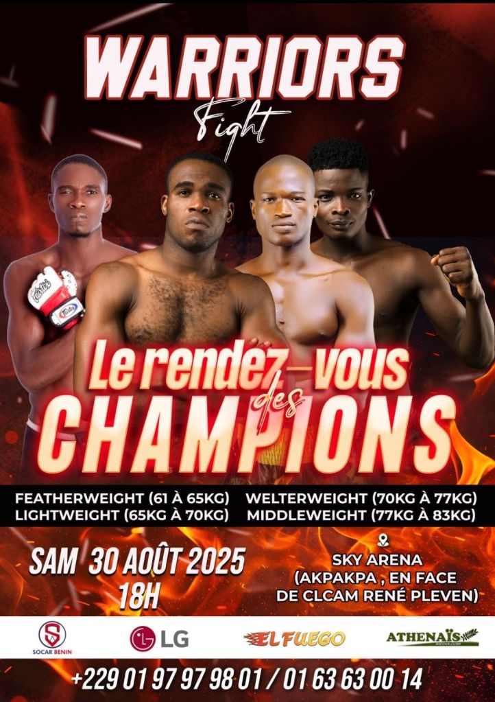 Ce 30 Août 2025 : le tournoi de MMA dénommé WARRIOR FIGHT 2ème édition ; donnera l’occasion à tous les combattants sélectionnés de pouvoir défier les champions du BFC9. Ceux qui auront réussi à les faire trembler dans le SKY ARENA auront l’honneur de pouvoir se battre pour les ceintures de BFC10 dans leurs catégories respectives. Le BFC 10 que nous aurons en Nov. 2025.